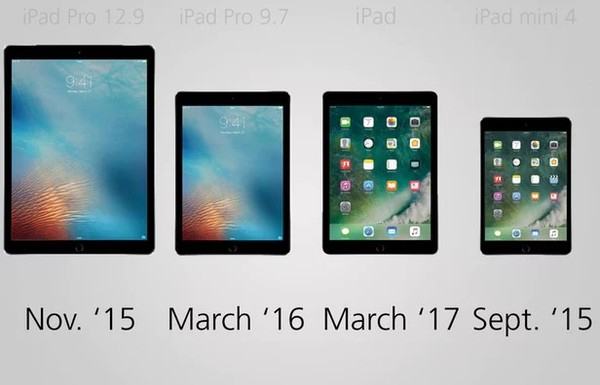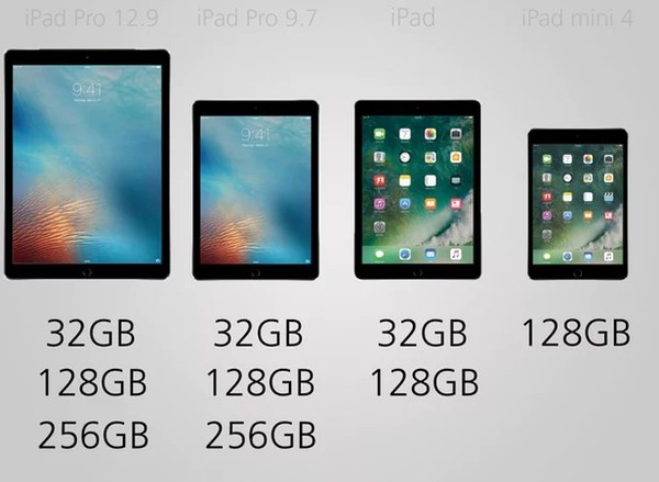 iPad mini 4的选择空间最小,最有128GB,iPad (2017)支持32GB和128GB,iPad Pro 12.9和iPad Pro 9.7有256GB可选。