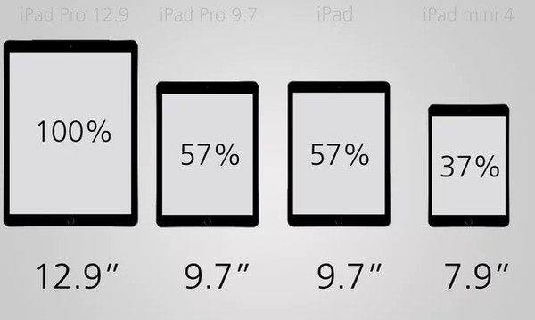 从图像表明,9.7英寸的iPad较小,不过这只是一种视觉,12.9英寸只是一种简单的放大而已,就像乔布斯当年说的那样,大多数人更喜欢最佳的9.7尺寸,大屏幕的智能手机成为常态后,苹果更换了产品线,推出了iPad Pro 12.9给更有屏幕需要的用户。