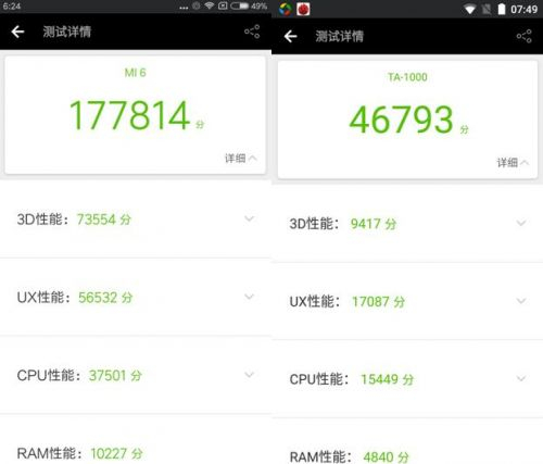 通过各项跑分数据来看,小米6手机安兔兔总分达到了177814分,而3D性能得分73554分;而Nokia 6手机的安兔兔总分达到了46793分,而3D性能得分9417分。通过这跑分对比来看,毫无置疑小米6在性能上完胜诺基亚6,小米6采用满血骁龙835处理器,相比上一代骁龙820,这次满血骁龙835直接从四核升级为八核,主频达到2.45GHz,可在各种使用场景中实现20%的性能提升。效率丛集主频为1.9GHz,但却是两个丛集中更重要的一个,因为80%的任务都将由其处理。而GPU戏能实现了25%的性能提升。在在《王者荣耀》测试中,小米6仍不支持高帧率模式,游戏帧率一直都维持在30帧上,还是非常的很流畅的。但对于其他游戏上全高画质无压力,畅快体验所有游戏。