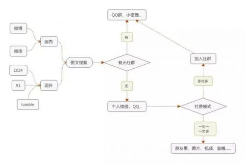如果说微信实现的是一对多的传播模式,那现在特别热门的小密圈实现的就是情色内容的多对多的交叉传播。这种模式下传播影响力会更大。