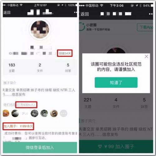 在付费进入这个情色交友的圈子的过程中,发生了一个有趣的插曲,页面弹出了“该圈可能包含违反社区规范的内容,请谨慎加入”的字样。但完成支付后,用户依旧可以加入该圈,依旧可以正常使用圈内功能。