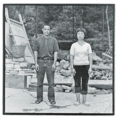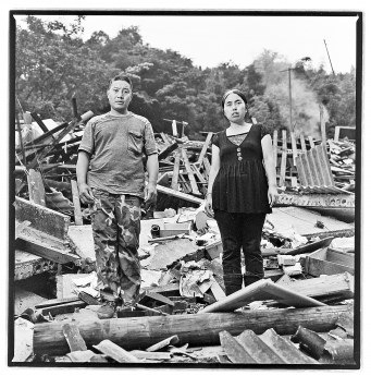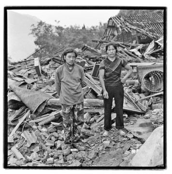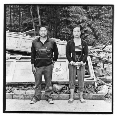 坟墓离他家不远,是他平日上学的必经之地。我随他父母回到家中,可房屋早已倒塌,生活用品也都埋在废墟中。我让夫妻二人站在房屋前照张合影,这是我选择十户家庭中的第一户。