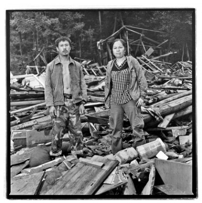2008年 丁本利、唐小红夫妇站在自家废墟前