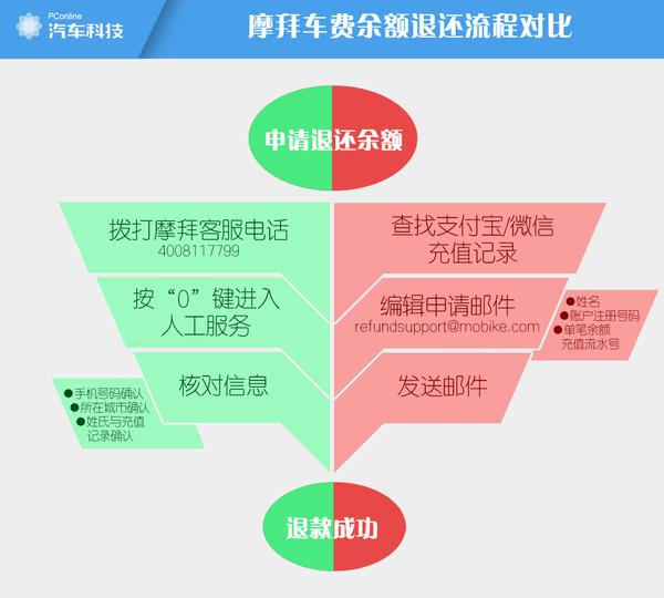 2| 车费余额怎么申请退还? 答:以邮件形式提供账户注册号码、姓名和单笔余额充值流水号,邮箱地址为refundsupport@mobike.com。但是我们友情建议直接拨打摩拜客服电话(4008117799),不到5分钟即可完成车费余额退还。