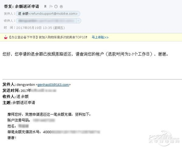 (图注:摩拜公布的邮件申请很容易打消退还念头)