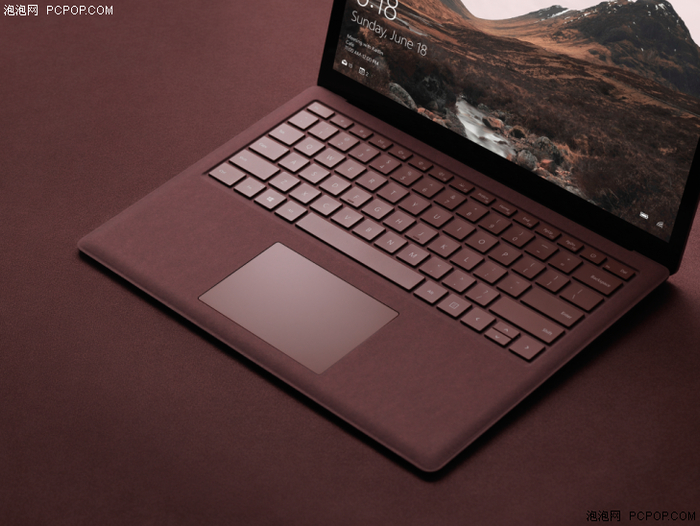 Surface Laptop的屏幕是方便触屏使用的3:2的比例设计,也是因为要考虑触屏所以没有采用时下流行的窄边框。但是Surface Laptop的键盘面采用的这种Alcantara“殴缔兰”材质,这种类似翻毛皮的织物材质不仅看上去十分柔和,摸起来也是特别柔软的。而且它表面的聚氨酯涂层具有防水、耐腐蚀的属性,创新、颜值与实用性一应俱全,微软就是想让Alcantara材质成为Surface系列产品的标志之一。细细观察就能发现,C面是中间略微凸起,键盘部分和边缘挤压向下的设计,像是皮包一样。
