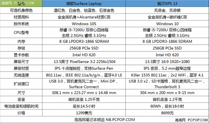 呃,Surface Laptop和XPS 13的配置段位设定都差不多,所以配置我就选了i5-7200U、8GB内存和256GB固态硬盘的。微软Surface Laptop的配色多一些,屏幕参数及功能看上去也是Surface Laptop更优秀一些,XPS 13有一个高能的Thunderbolt 3接口。其他方面如尺寸轻薄、重量还有续航这些算是平分秋色的,售价上Surface Laptop没有国行官方价,而美国XPS 13也没有i5-7200U、8GB、256GB这样的配置,所以就写了国行官方价。配置么,一些冷冰冰的参数,要对比还是多看些实物图合适。