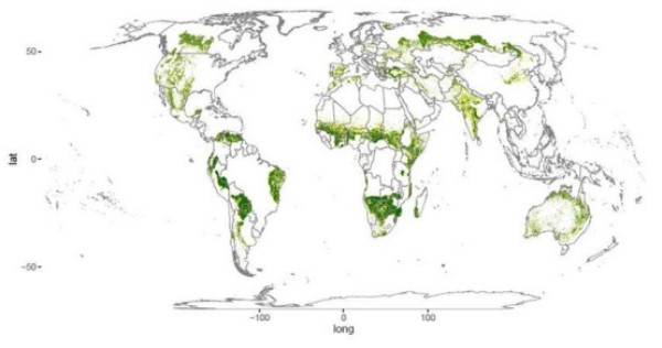 我们在有人居住的陆地上发现了新的旱地森林,但这些森林主要分布于撒哈拉以南非洲地区、地中海附近、印度中部、澳大利亚海岸、南美洲西部、巴西东北部、哥伦比亚和委内瑞拉北部以及加拿大和俄罗斯北方森林的北部。在非洲,我们的研究使已知的旱地森林面积增长了一倍。