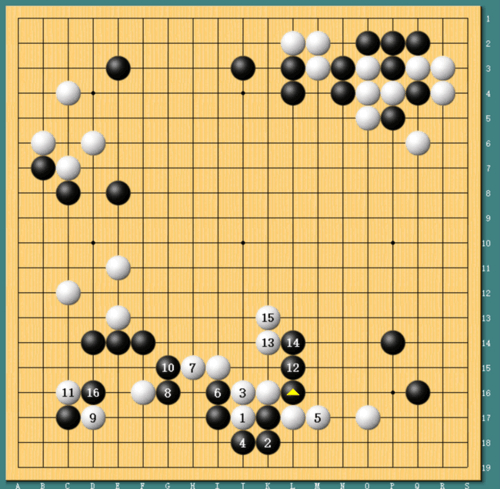 柯洁脱先拆边,AlphaGo黑1逼住白棋。柯洁的白2似乎有些猛,是寻求战斗的下法,黑3从心情上很想于白4位跳出,但实战AlphaGo再次简明处理,柯洁白6打入,再次求战。研究室认为开局虽然黑好调,但柯洁的发挥比第一盘好很不少。