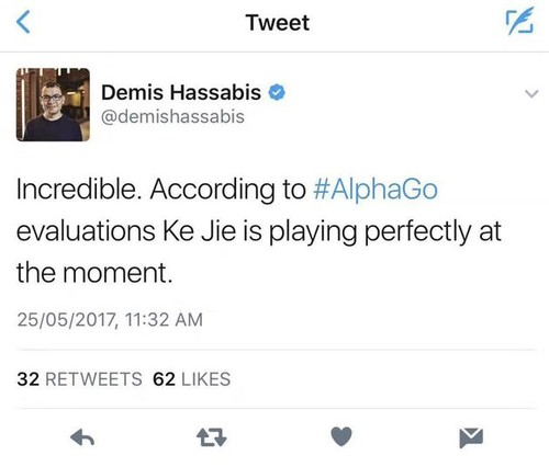 在柯洁剩1小时50分、AlphaGo尚余2小时36分时,DeepMind创始人哈萨比斯关注比赛走向,并于11:32推文大呼不可思议,称根据AlphaGo的评估,柯洁现在下得很完美。