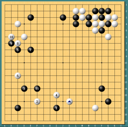 AlphaGo黑3落子三三,白4小目应对,前4手与首局一模一样,AlphaGo竟然有针对性的采用了柯洁前日的开局。