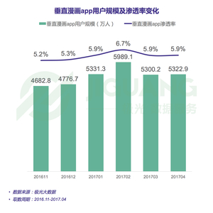 截至2017年4月,垂直漫画app市场渗透率高达5.9%,用户规模约5322.9万