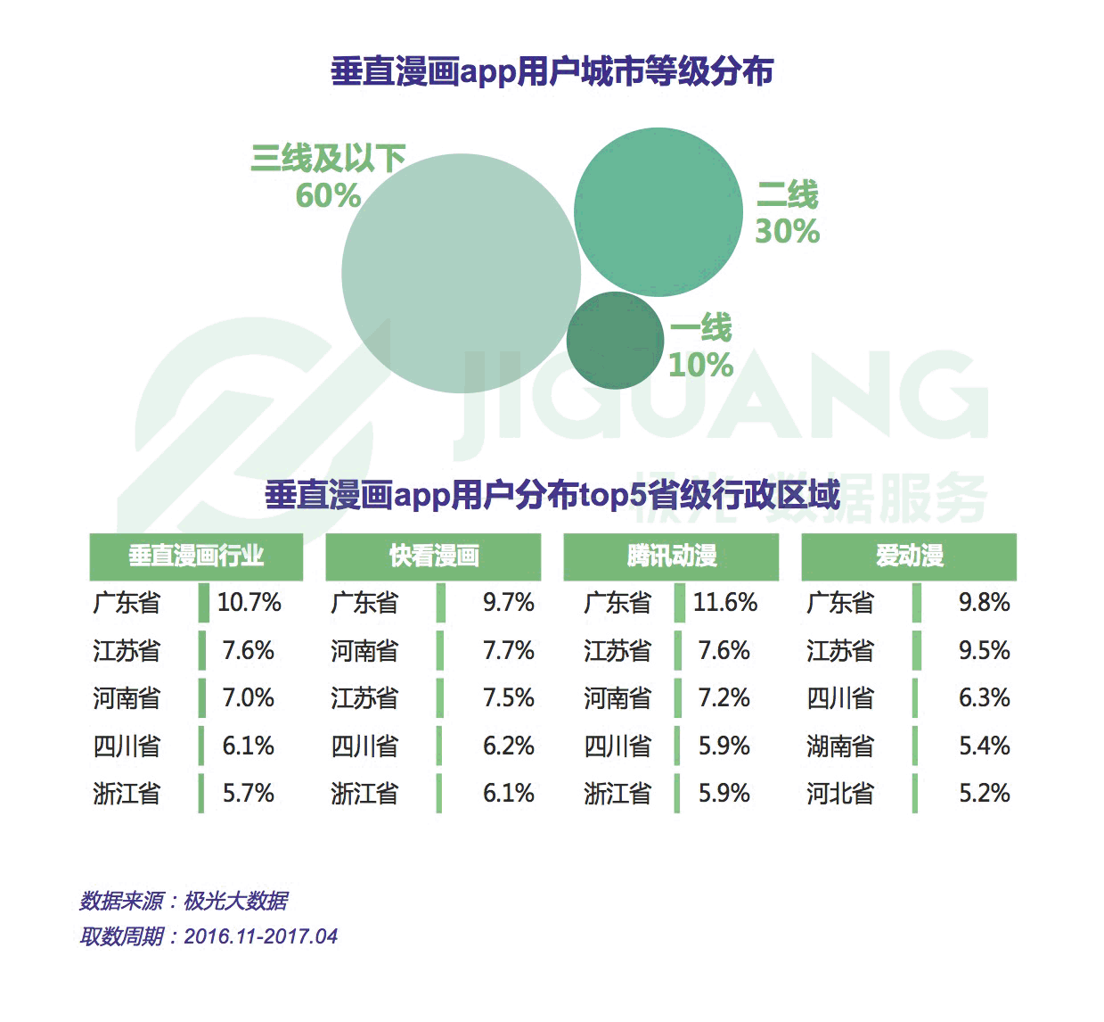 垂直漫画app用户近1/3集中在二线城市,约10%来自广东省