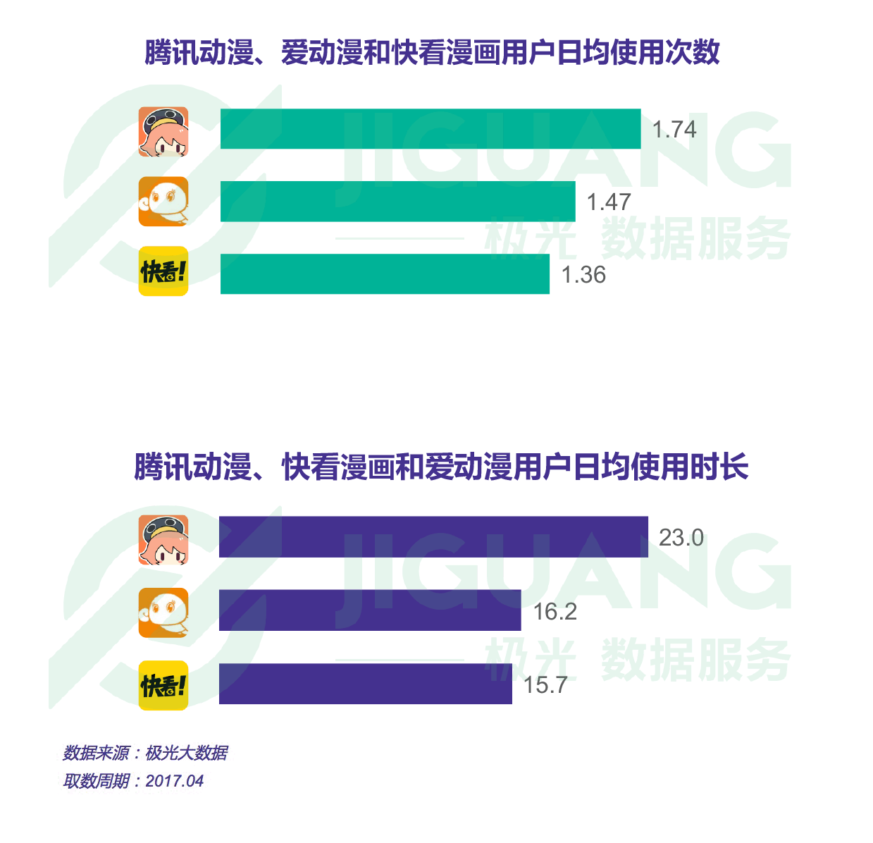 • 极光大数据显示,2017年4月,腾讯动漫用户平均每天使用次数为1.74次,每次使用23.0分钟