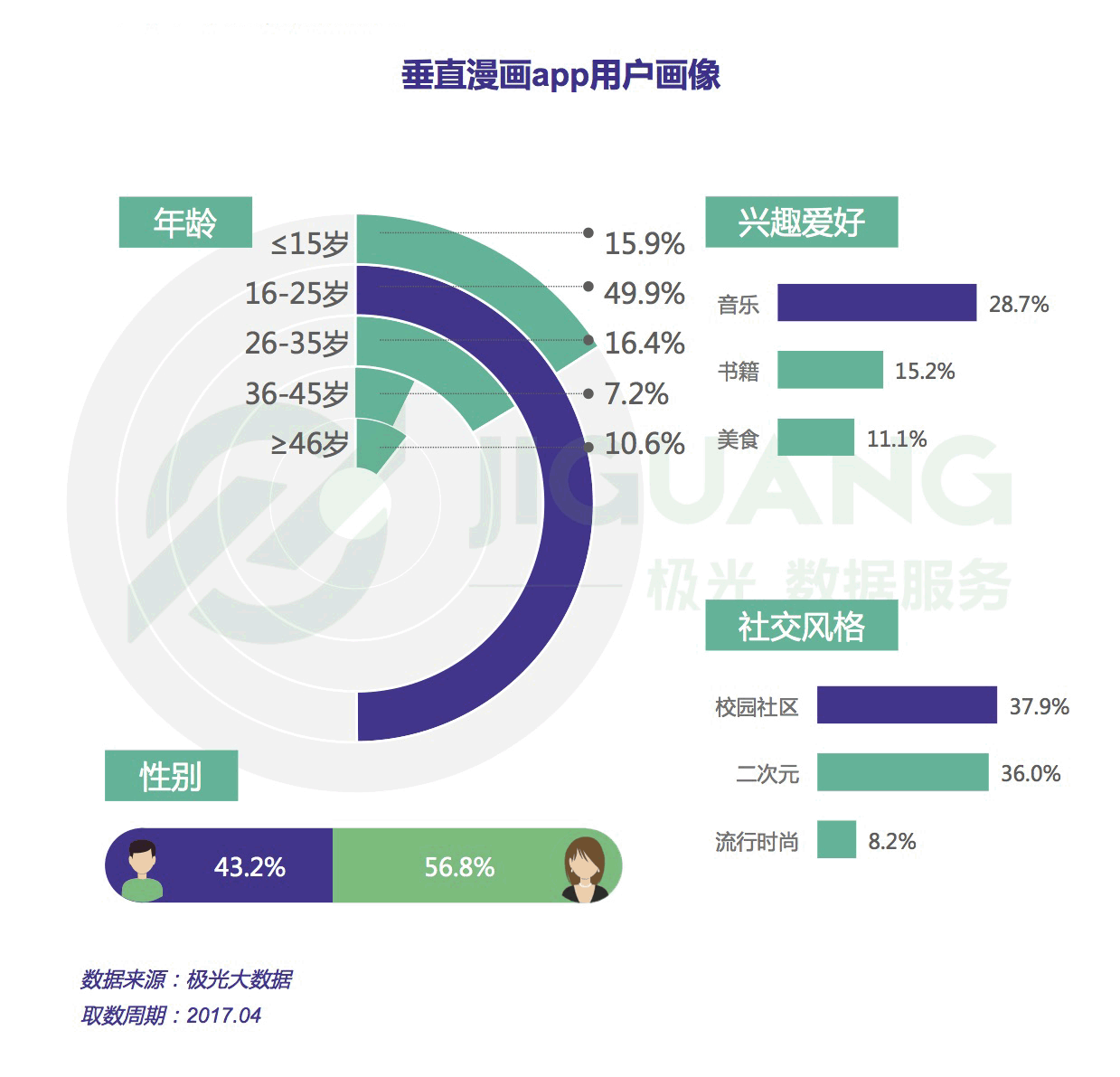 垂直漫画用户:男女比例约为1:1.3,约半数用户为16-25岁