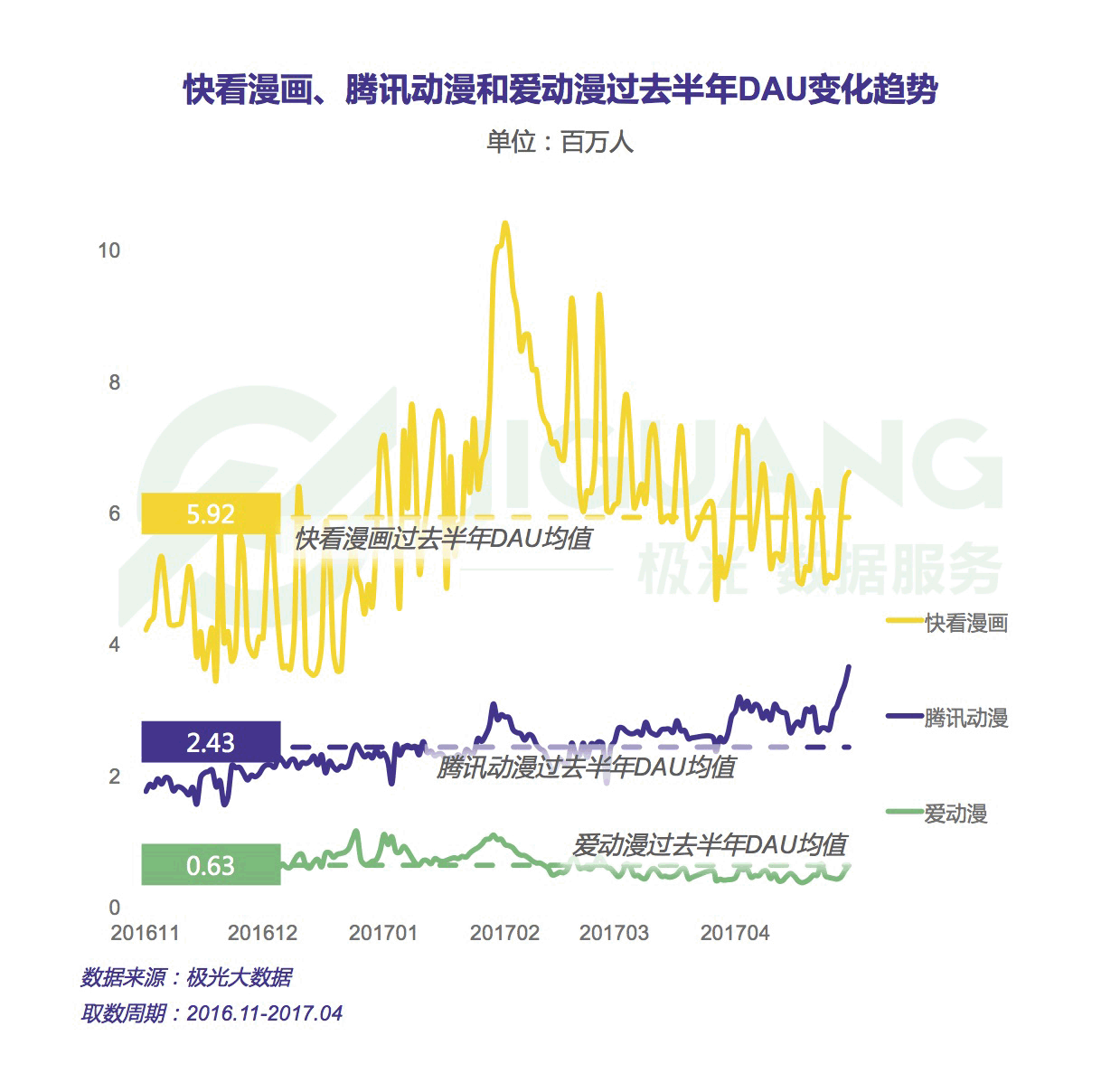 • 2016年11月至2017年4月,快看漫画DAU均值约为592万,腾讯动漫约为243万,爱动漫约为63万