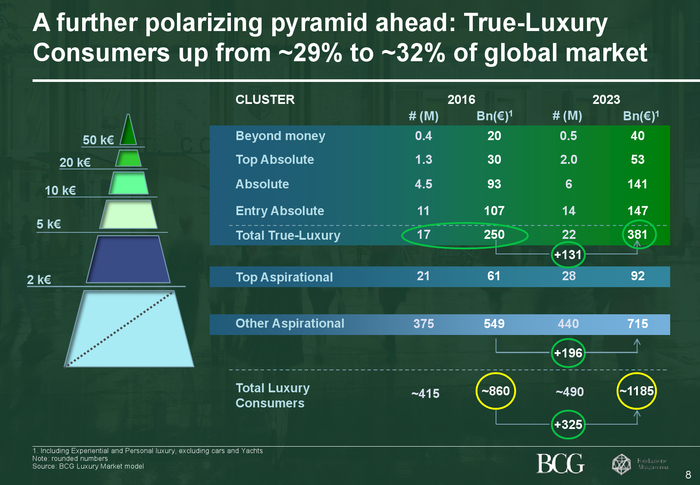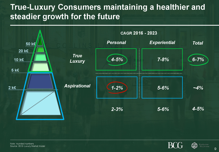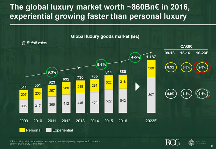 波士顿咨询公司(BCG)和意大利奢侈品行业协会(Altagamma Foundation)联合开展的调查研究显示,未来几年内,全球奢侈品行业的增速将由近几十年的年均8%-10%,降至2%-5%区间。据估计,目前全球奢侈品行业(包括商品购买及体验消费)总值约为8,600亿欧元,到2023年预计将达到约1.2万亿欧元。