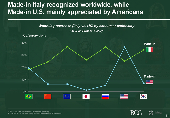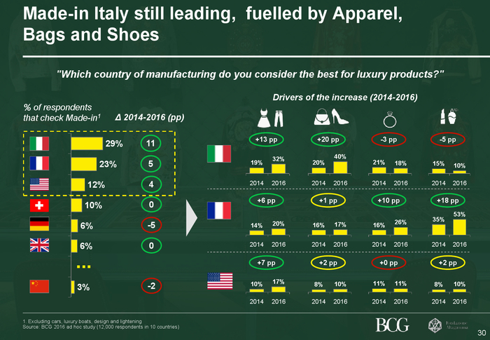 “意大利制造”比“法国制造”更具魅力此次调查显示,在十个国家消费者心目中,“意大利制造”的奢侈品对消费者更具吸引力;29%的受访者偏爱“意大利制造”的奢侈品,而23%的受访者青睐“法国制造”的奢侈品。“意大利制造”的产品在服装和配饰(鞋类和箱包)等品类表现格外强劲,分别有32%和40%的受访者表示喜欢。“法国制造”的产品在珠宝和手表(26%的受访者)以及香水和化妆品(53%的受访者)等品类依旧坚挺。