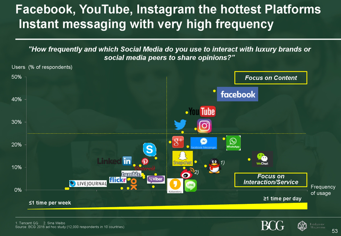 企业应重新审视数字化战略如今,奢侈品牌的网站已无法满足消费者所期待的客户体验。成熟消费者通常会去实体店或商场购物,年轻一代则偏爱多品牌云集的网上集合店,以便其对产品进行比价或搜索特价商品。此外,网络社交媒体亦成为品牌与消费者之间沟通和互动的关键渠道。现在,约72%的消费者通过社交媒体与其钟爱的品牌进行互动,且六成消费者对社交互动青睐有加,导致口碑宣传已领先于杂志等传统媒介,成为了品牌推广的首要渠道。Facebook、Instagram和YouTube仍是目前消费者最常用的社交媒体。由于中国(华人)消费者的崛起,微信的重要性也非常明显,与其它社交软件不同的是,消费者用微信获取奢侈品信息及与品牌互动的频率非常高。