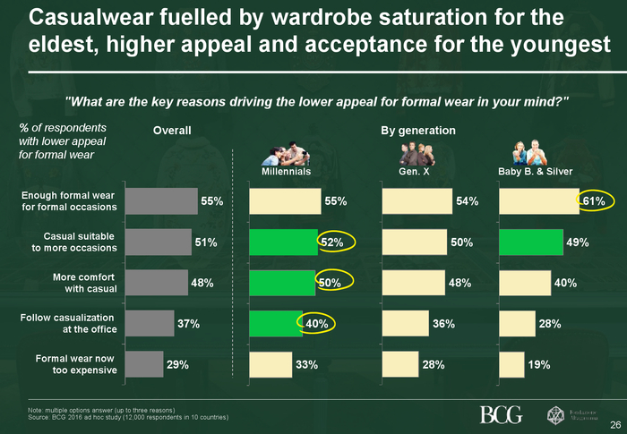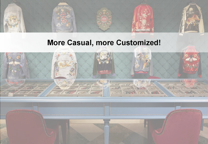 消费者对休闲款日益青睐三分之二的消费者不再像以往那样热衷于正装。这主要是因为熟龄消费者衣橱里的正装已经可以满足正式场合的需求;此外,年轻一代在正式场合的着装风格也正逐渐休闲化。同时,个性化,特别是定制化产品的需求日益增强,并成为了提升消费者购买意愿的有效途径。这一趋势在服装品类格外明显,20%的消费者(大多来自法国和意大利)对定制服装情有独钟。