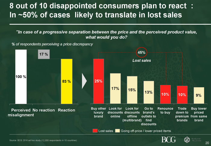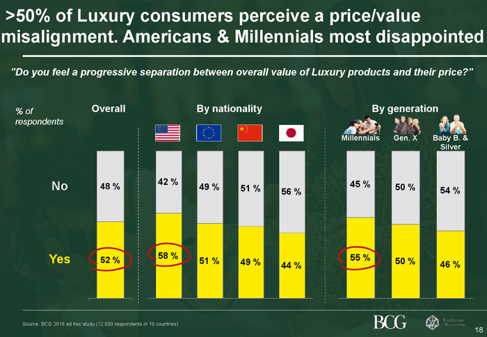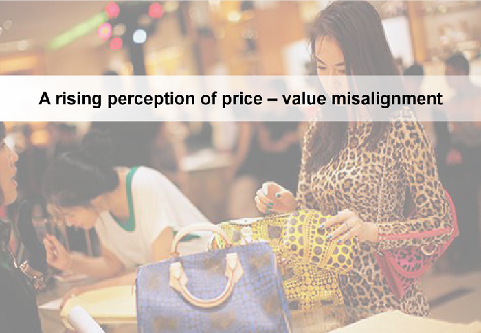 奢侈品价格与价值之间的感知差距日益增大奢侈品牌应对消费者如何感知其产品价格更加重视。此次调查显示,半数以上的受访者认为某些奢侈品的价格与实际价值不符。美国消费者与千禧一代对这种价格与价值的脱节格外敏感。对于多数消费者而言,这种脱节体现在价格的上涨(例如,手袋的价格增速较通货膨胀率领先了整整三倍),而对于另外三分之一的消费者,这种脱节则体现在奢侈品质量的不断下滑。八成消费者因此将会改变他们的购买行为,或选择质优价高的顶级品牌,或寻找性价比更高的轻奢或中高档品牌。换言之,就是升级或降级消费。
