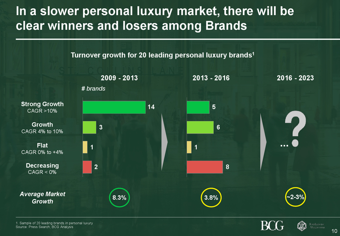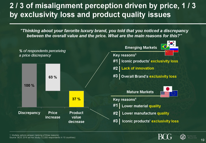 全球奢侈品市场的结构性放缓伴随着消费模式的关键性转变,这些转变不断改写着奢侈品市场的竞争格局。消费者比以往更加重视奢侈品让他们所真正感受到的价值,重视原产地,这就导致某些品牌和产品变得更有竞争力。品牌需持续调整品牌与产品策略,确保在新环境下始终赢得核心消费者。