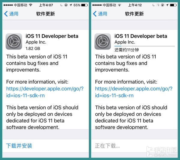 从升级难易度来说,iOS 11开发者预览版还是蛮好升的,通过安装描述文件重启后即可开始下载更新,不过可以看到iOS 11的文件包几乎快2G了...16GB的童鞋还是慎重吧。