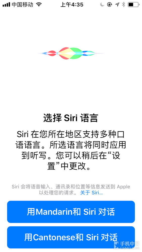更新完成后,可以看到引导界面和之前已有所不同,字体也显得更粗一些。令人讶异的是,Siri语言默认提供了普通话与广东话可选,不过...都是用英文来呈现的,或许是BUG吧:(