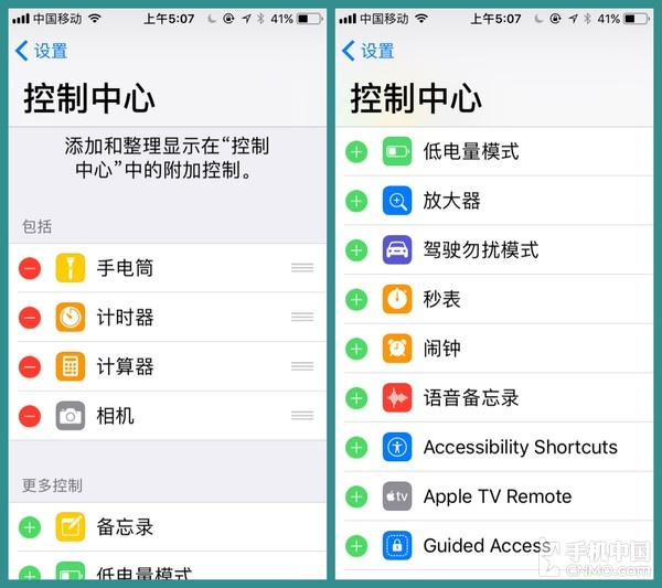 在设置中,对于控制中心的功能按钮也可以自定义了,无论是闹铃还是低电量模式等,在自由度上肯定是比以前大大增强了,这点还是值得肯定的。