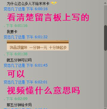 他们一般会在世界频道发布:“视频给米卡”、“看板给米卡”等类似信息,这里的视频指的是裸聊,女孩子可以点击世界频道的链接,在游戏中加好友,联系上这些人。
