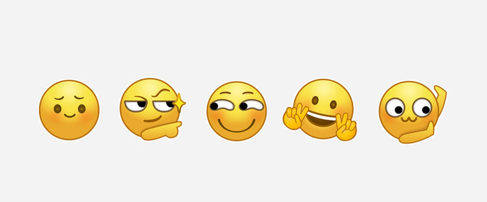 由左到右分别为微信的新 emoji:「皱眉」「机制」「奸笑」「耶」「嘿哈」,也是目前为止,微信最受欢迎的 emoji。