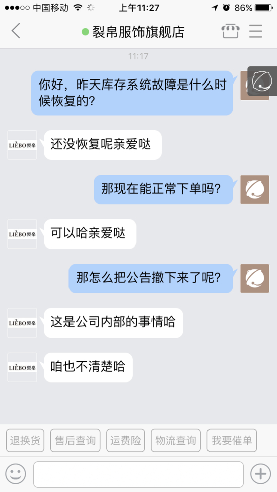 一边是库存系统仍未恢复,一边是买家能正常下单,裂帛有些自相矛盾的回应不免让人心生疑虑。而茵曼的拒绝回应也让人摸不到头脑。因为一旦公告被撤下来,有很多不知情的消费者可能就会继续下单。对于商家来说,如若库存系统不可控,势必影响订单的处理,很有可能造成“超卖”情况。之于不知情的消费者而言,买到一个无法按时发货的商品恐怕也是非常糟糕的体验。
