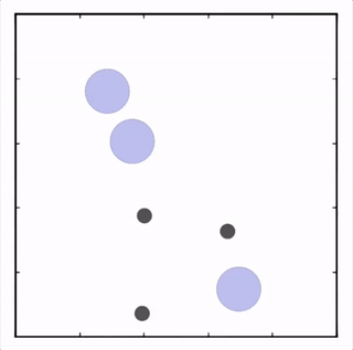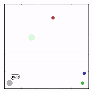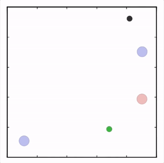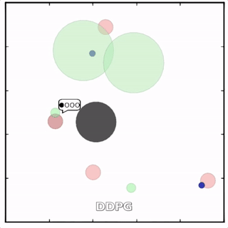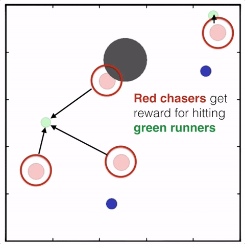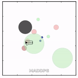 上图展示了,通过MADDPG训练的红色智能体比起通过DDPG训练的红色智能体表现出了更加复杂的行为。在上图的动画中,通过MADDPG(左图)和DDPG(右图)训练的红色智能体试图追逐绿色智能体,这期间它们可能需要通过绿色的森林或者躲避黑色的障碍物。