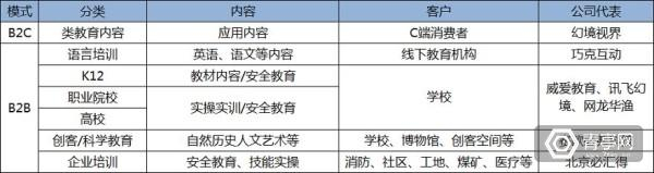 因为头盔的原因,VR教育适用人群在12岁以上,但国内已开发出适用于6岁以上的VR硬件设备。至于3~6岁这个阶段的早教,基本被AR承包。总体而言,所有 VR教育公司都面向B端市场,其角色是内容应用开发商或方案商。至于面向C端内容,最典型的是国外团队打造的语言学习应用《House of Languages》,国内的是幻境视界团队推出的艺术欣赏应用《梵高的秘密》。因为内容不具有针对性,难以起到教育效果,所以这些归类为“类教育”内容,接下来不对其讨论。