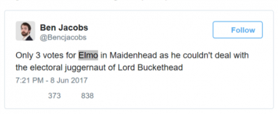 遗憾的是,由于铁桶领主的政治手腕太 OP……Elmo 在梅登黑德选区只拿到了 3 票。