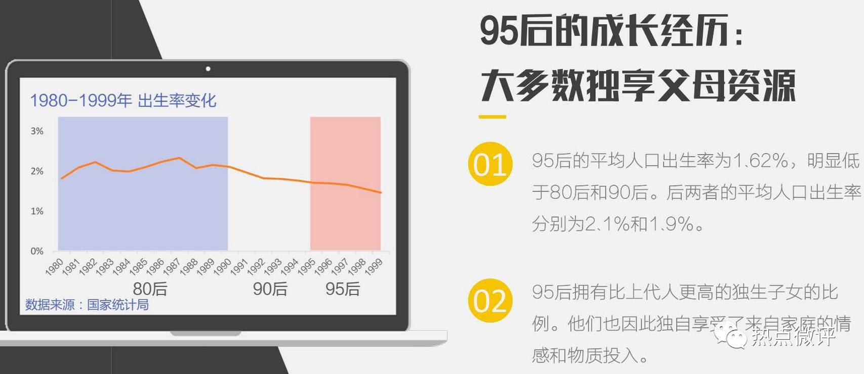 他们的人生历程相对80后少了磨难,多了精神与物质的富足以及父母的宠爱。根据企鹅智酷的《解剖95后》报告,95后的平均人口出生率为1.62%,明显低于80后和90后。后两者的平均人口出生率分别为2.1%与19%,也就是说,95后拥有比上代人更高的独生子女比例,他们也因此独享了父母的资源,包括情感与物质投入。