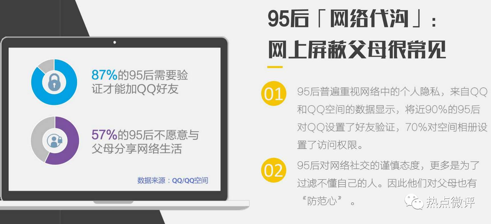 但95后又是矛盾的,它们急于跳脱出父母对自己生活圈子施加的影响,所以我们看到它们更乐于在朋友圈展现自我,但屏蔽父母的行为又非常常见。企鹅智酷《“解剖”95后》报告显示57%的95后不愿意与父母分享网络生活。它们对父母有很强的的防范心。