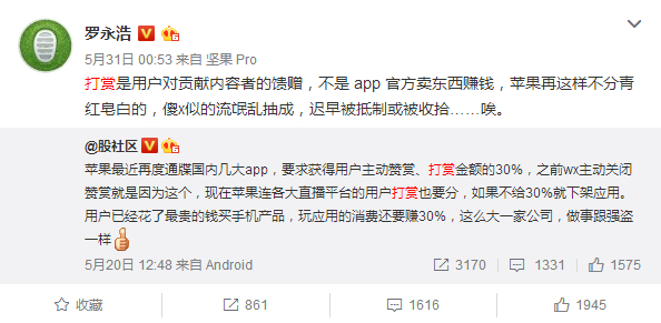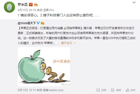 除此之外,科技大佬也连连发声,斥责苹果的行为。通过在陌陌做直播赚取20余万元打赏费的锤子科技创始人罗永浩于5月底指责苹果的抽成行为是“傻x似的流氓乱抽成”,称“打赏是用户对贡献内容者的馈赠,不是app官方卖东西赚钱”。在苹果正式宣布对应用内打赏抽成30%以后,罗永浩于6月11日再次对此发表自己的看法,认为这“确实很恶心”,并讽刺道,“锤子科技掌门人也没有那么激烈”。