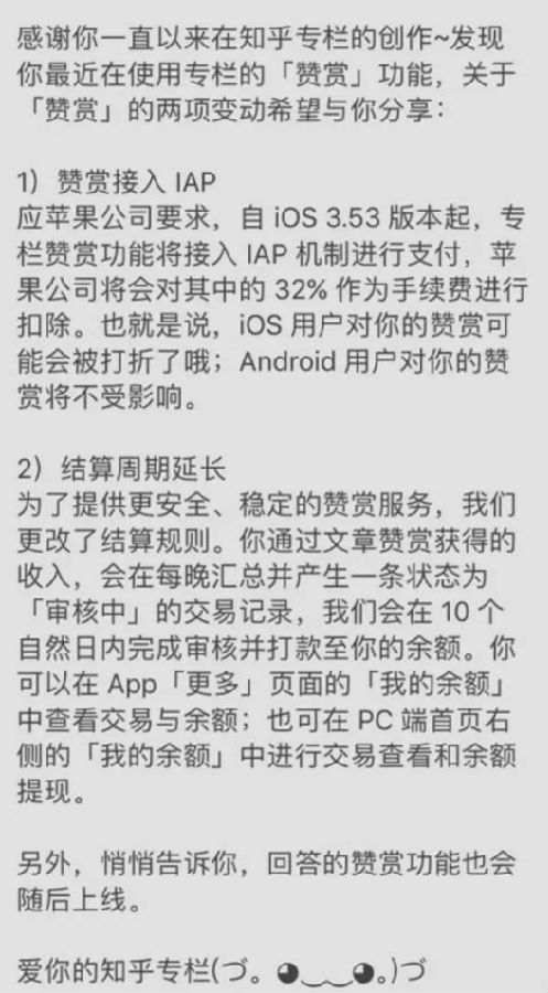 6月9日,国内问答平台知乎旗下账号知乎专栏对外发布公告称,应苹果公司的要求,从iOS3.5.3版本的知乎APP更新之后,专栏赞赏功能将介入IAP付费机制,苹果公司将从中扣除32%作为手续费。换言之,用户只能获得剩下的68%的赞赏分成。