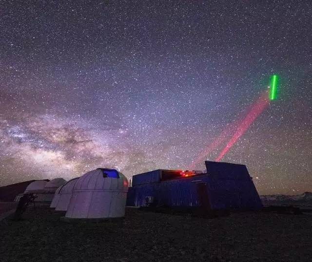 这个也是当时阿里站的三个发射单机,绿色的也是量子星过境的时候,这个也是在阿里站拍的,天气非常好的时候,这个星空我觉得你如果身临其境看星空,你会发现如果你有密集恐惧症的话,可能会很难接受。真的是被天上的星星亮瞎你的双眼,这个也是银河。这个也是我们另外一个地面站,我觉得这样的图片的意境其实是很好的,我感觉就好像我们红色的信标光就是我们的一把利剑一样,我们在对着星空亮剑,亮的我们人类科技的剑。这是一个动图,多张照片合成的,让大家感受一下量子星过境的时候,感受是什么样的。