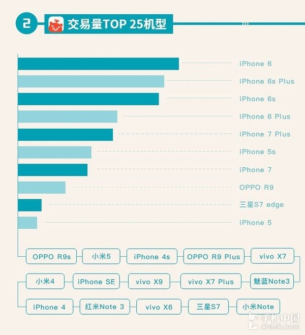 将榜单往下延伸到TOP25,安卓阵营和国产阵营的面子会稍微挽回点。但是,iPhone 4和iPhone 4s这样的机型竟然在列,而且,排名靠后机型的交易量和iPhone比起来依然显得孱弱和无力。安卓品牌:我能怎么办,我也很绝望啊。