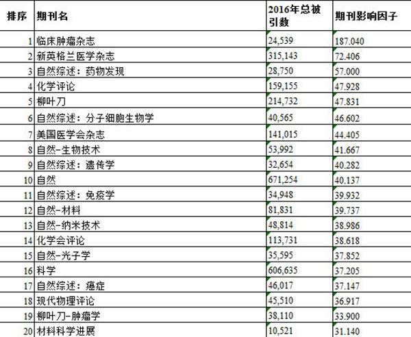 为人们所熟知的一些期刊中,《柳叶刀The Lancet》2016年影响因子为47.831,《自然Nature》为40.137,《科学Science》为37.205,《细胞Cell》为30.410。