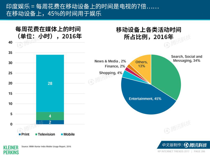 6月,玛丽·梅克(Mary Meeker)的互联网趋势报告也显示着:在印度,智能手机的普及,流量资费的下降,促使印度民众的娱乐方式也日渐移动化。而基于移动设备的网络视频正在取代基于电视的肥皂剧和真人秀。