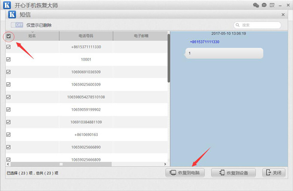 第六步:扫描完成后,我们可以看到所有从iPhone中扫描出来的短信数据。我们需要对iPhone手机中的短信进行备份,我们勾选左上角“姓名”旁的黑色小方框,就能够选择所有短信。最后点击下方【恢复到电脑】并选择备份路径,就能够将iPhone中所有的短信都备份到电脑上了,备份文件是以表格格式和网页格式呈现的,很方便我们进行查看。