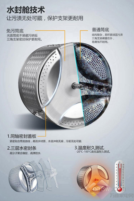 说起免污这个技术,确确实实是真的实用啊,通过特殊的构造及水密封系统,做到了真正的免污清洗,让洗衣机内部不在藏污纳垢,也无需为了健康频繁的清洗,既方便又健康。