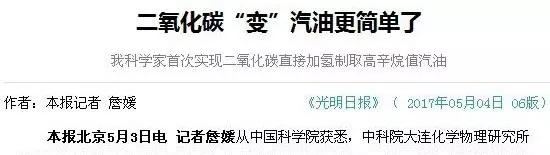 进入5月份,《光明日报》等权威媒体报道称:中科院大连化学物理研究所孙剑、葛庆杰研究团队发现了二氧化碳高效转化新过程,首次实现了二氧化碳直接加氢制取高辛烷值汽油 ,相关过程和催化材料已申报多项发明专利,并被审稿人誉为“二氧化碳催化转化领域的突破性进展”。二氧化碳真能变成汽油?