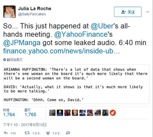 在卡兰尼克宣布休假的时候,根据雅虎新闻获得的泄露的音频,董事会成员Arianna Huffington在一次全体会议上对员工进行了交谈,她说“有很多数据显示,当董事会中有了一位女性成员,就很有可能增加第二位女性董事成员。”但另一名Uber董事会成员David Bonderman竟对此回应道:“实际上,这就是说公司以后有更多的闲言碎语。”