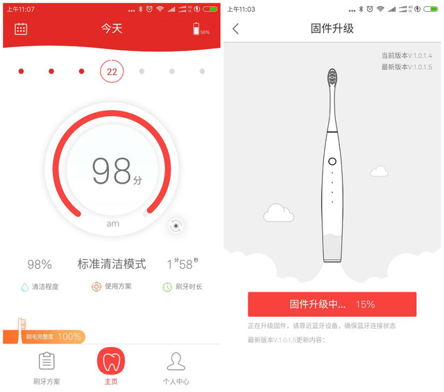 牙刷和APP链接后的主界面会为用户每次刷牙后的效果做一个评分,包括刷牙时长、清洁程度等等,在APP的左下角还会提示牙刷刷头的使用寿命的百分比,最重要的是这款牙刷支持固件升级,也就是说未来这款牙刷可以实现更多好玩的玩法。