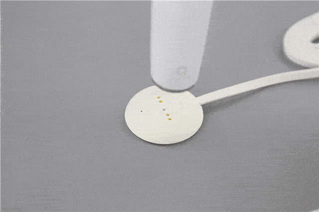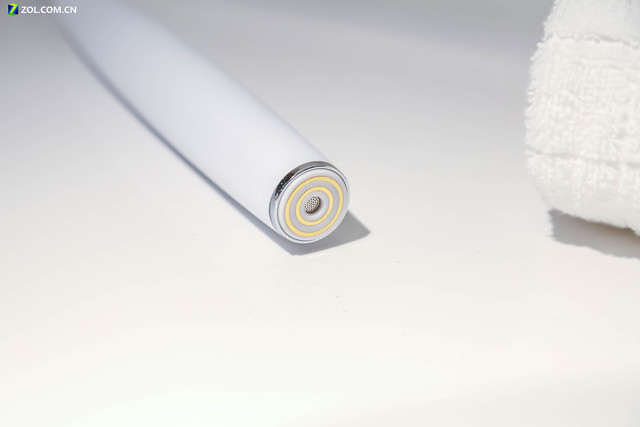 底部的设计跟普通的电动牙刷有一些区别,中间网状的圆孔实际上是一个音箱,内置的 Dialog 第三代智能芯片+蓝牙4.2BLE,具有智能语音提醒功能,还可通过 APP 定制语音备忘录。这也是笔者第一次用过的带中文语音的电动牙刷产品。