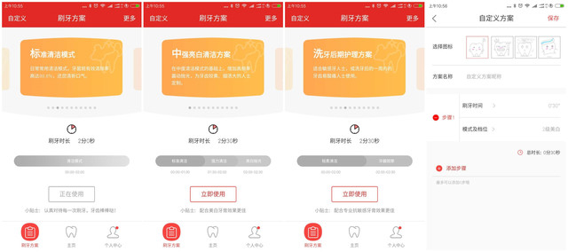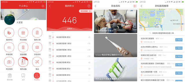 同时这款APP还设置了很多附加的功能,比如刺激用户刷牙的积分奖励系统(用户可以通过刷牙获得积分来换取刷头等奖励)、牙齿百科、附近医院、售后等等。